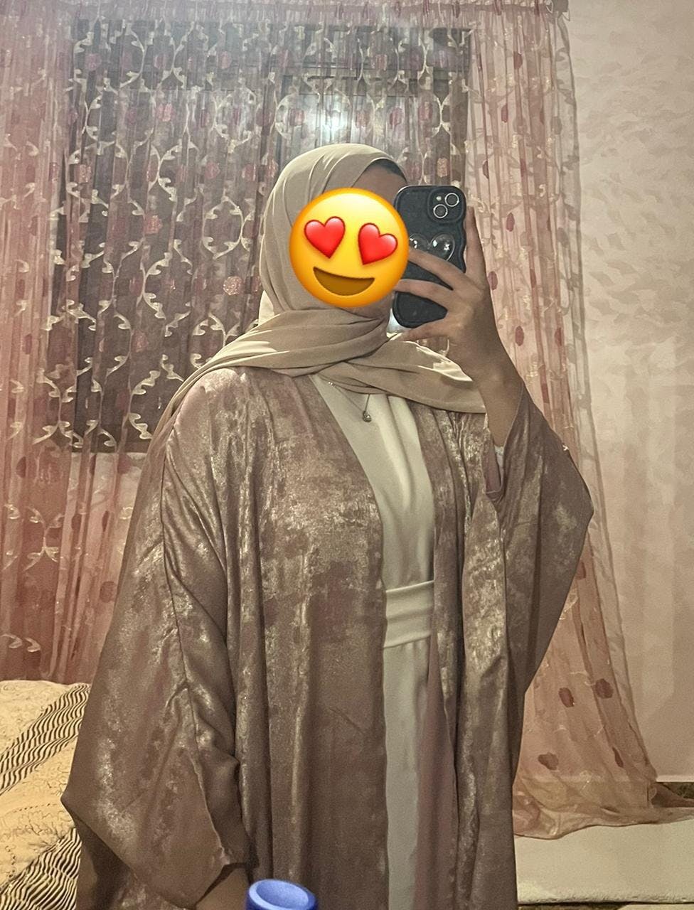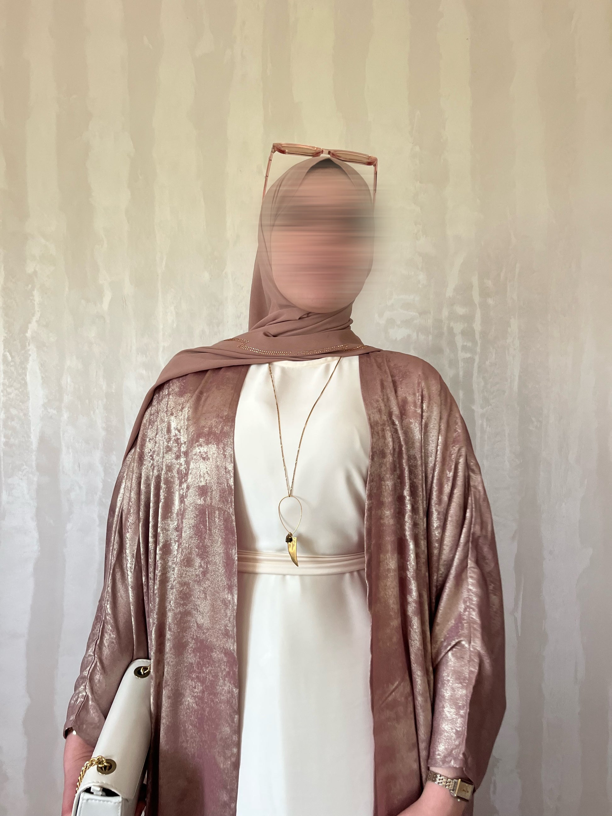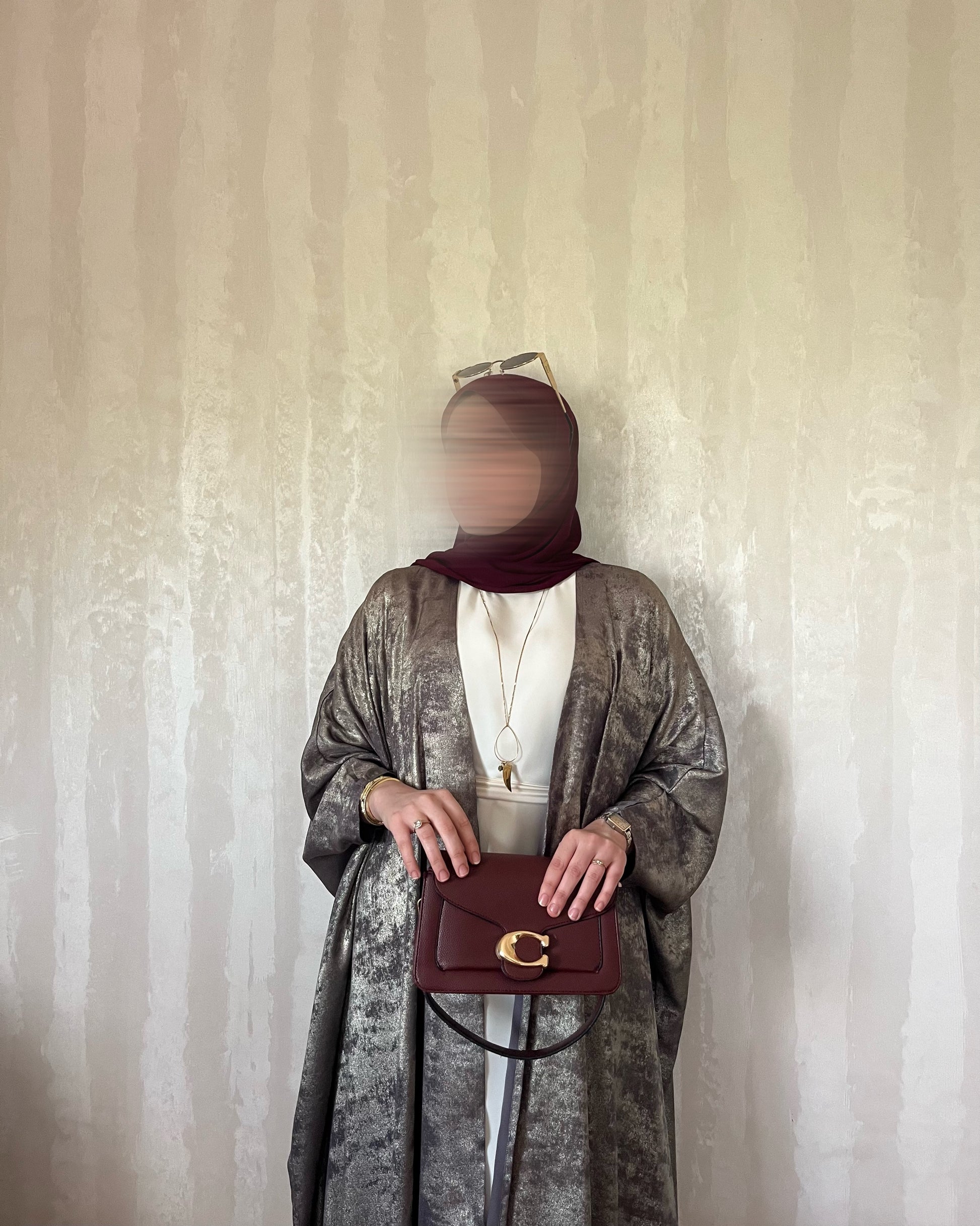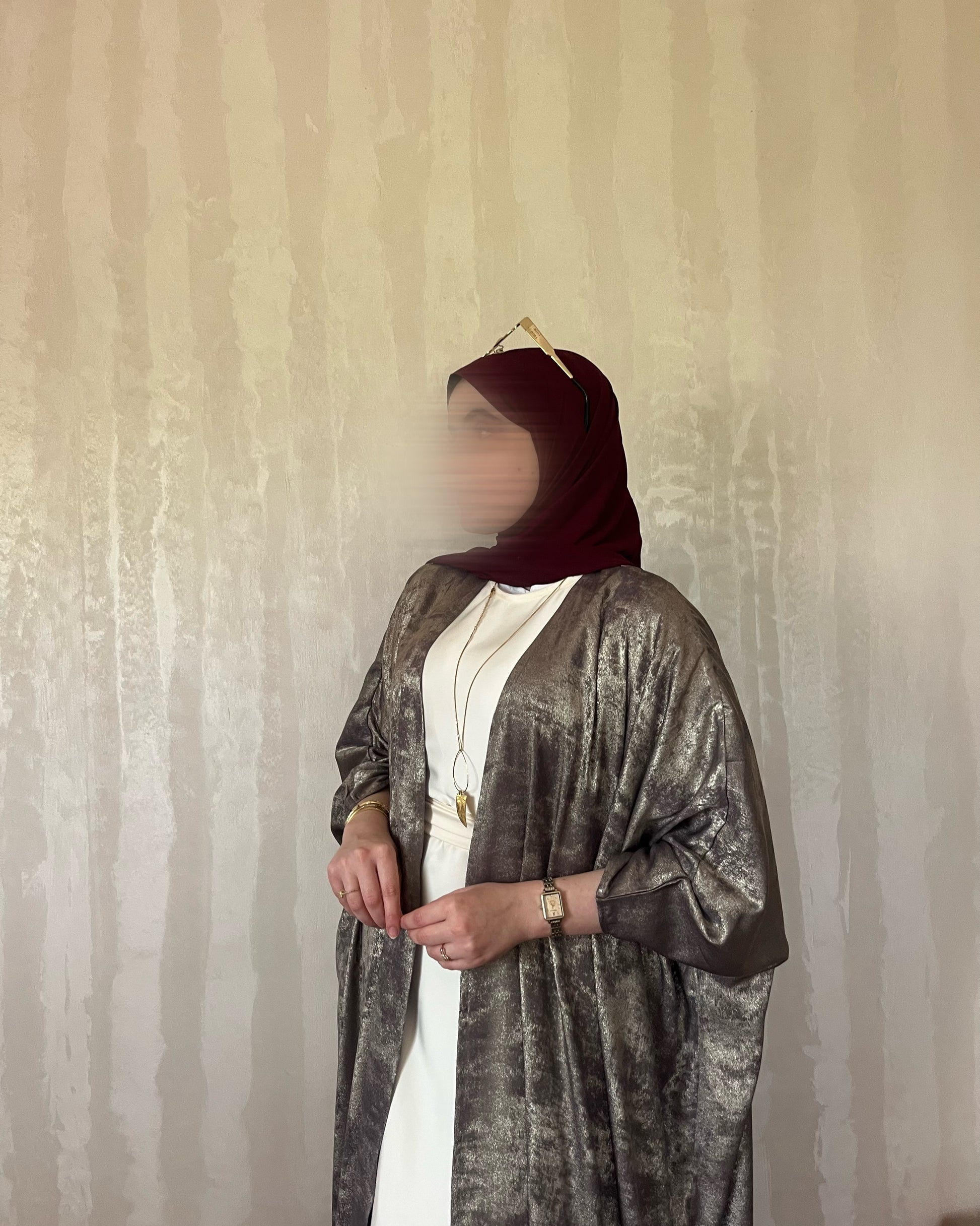 Abaya confectionnée en tissu Lami / Velours lami, sélectionné pour son aspect subtilement lumineux et son rendu luxueux